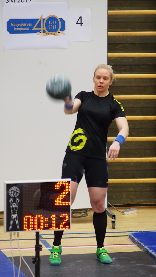 Jotenkin onnistuin turruttamaan ahdistuksen tunteen siihen pisteeseen että sain käveltyä lavan taakse. Muistan kun noston alkaessa tartuin kahvaan ja kauhukseni totesin sen olevan järkyttävän karhea. No tää ei kestä pitkään eikä ole mitään väliä jos kädet aukeaa, päässä tykitti. Seuraavalla kerralla pitää mankata itse. Nostosta en muista juuri mitään, en miltä tuntui, en miten se meni, ei mitään muistikuvaa tuomarista. Jossain vaiheessa tajusin että vieressä nostanut Teija vaihtoi kättä, ennen mua…? Seuraava mielikuva on että Teija lopettaa, vilkaisin sen tulostaulua, tasoissa. Jos ei muuta niin sisulla perkele, 5 toistoa B-rajaan. Huono ote kahvasta ja kuula lipesi käsistä kahta toistoa vajaana. Mutta hei, kuula lipesi ylöspäin, ei eteen.
