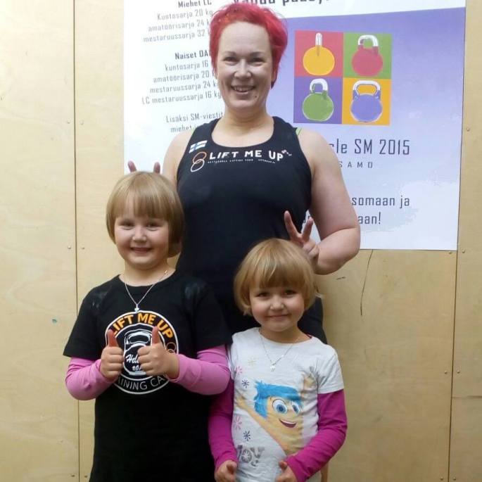 Fanikuva. Ei sentään omia lapsia nämä mutta ylipuhuttavissa kahvakuulaurheiluun.